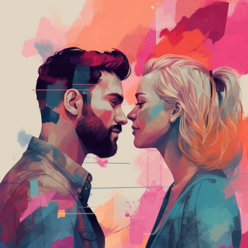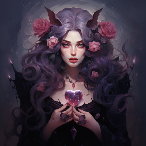 A witch with the emotion of love on her face, with touches of purple, pink and red, heart-shaped flowers and heart-shaped cut rose quartz gems.