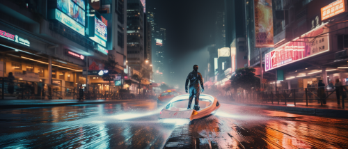 DENNIS rodman water skiing in the middle of a busy street in hong kong. keywords: water skiing, hong kong, neon, night, arri alexa mini, low key --ar 21:9