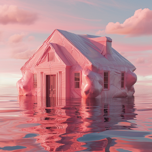 a house made of an inflatable material, floating on water, surreal, magical, soft pink, --v 6.0