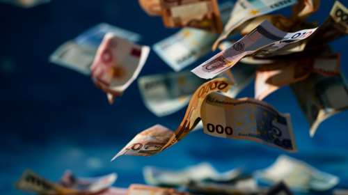 flying Euros notes on a simple navy blue background, shot by canon Eos Mark IV, --ar 16:9 --v 6.0 --style raw