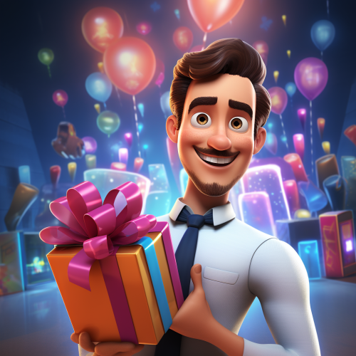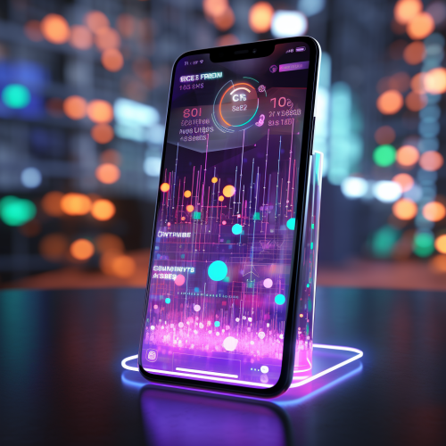 Visualize a futuristic computer or smartphone screen with a vibrant and glowing update notification, showing a progress bar at 99% for the year 2024. Surround this with symbols of technology and celebration, like digital confetti, neon lights, and holographic displays.