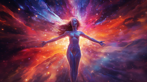 Luminous Dakini, a Cosmic Dancer, flying in a brightly coloured galaxy, abstract, 8k, v 5.2 --ar 16:9