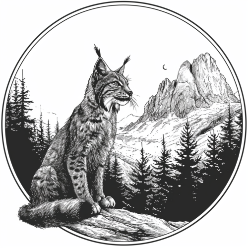 black and white high contrast thin outline, circular border, lynx cat majestically posing with mountain background and pine trees, simplified minimal thin outlines --v 6.0