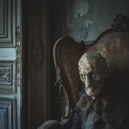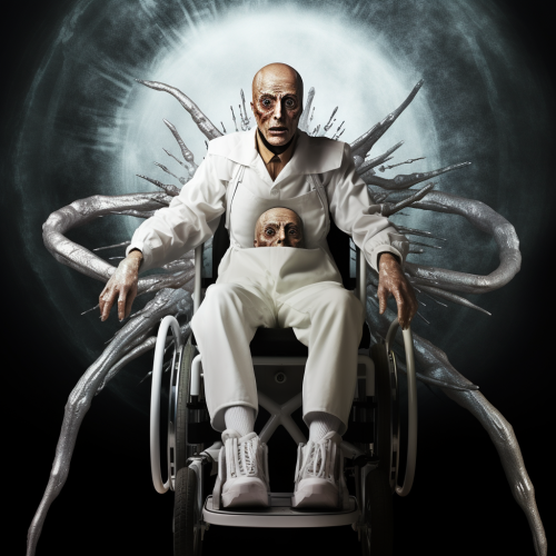 A gaunt and thin man with huge head, dressed in dirty white jumpsuit. he is carried in a spider legged wheel chair. his head has veins popping out and his eyes are hypnotic. make it seem like he is controlling the viewer with mental powers.