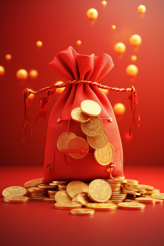 A blessing bag contains gold coins, gold coins overflow the bag,Chinese style, 3D, C4D , light red background studio, clean background --ar 4:6