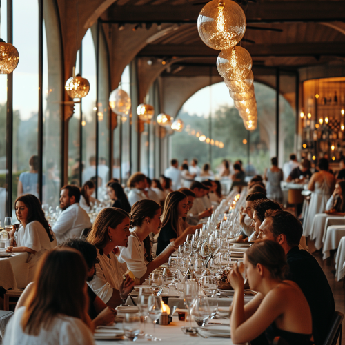 Many Peoples drinking wine in a bright city view huge reastaurant, light white colour scheme --ar 1:1 --style raw --stylize 250 --v 6.0