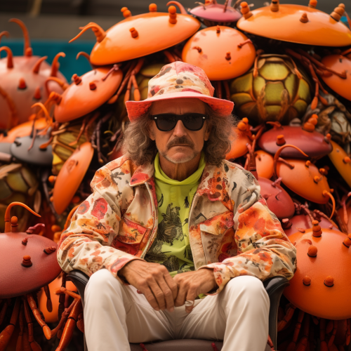 The author Clark Thomas Carlton wearing psychedelic clothing and standing among gigantic ants <@1068372278565413047>