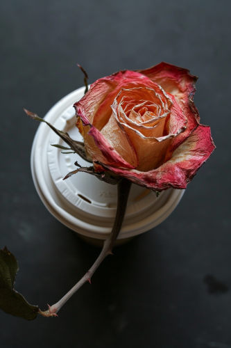 The top of the coffee cup lid has a withered rose flower, in the style of vancouver school, packed with hidden details, close up, white and crimson, quietly morbid, plastic, romantic honesty,feminine sticker art,i can't believe how beautiful this --ar 2:3 --v 6.0 --style raw