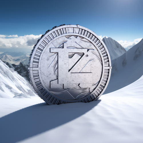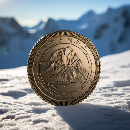 the word with "IZN" on the coin on the snow mountain. simple cyberpunk --ar 1:1