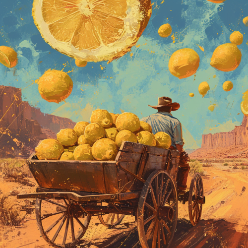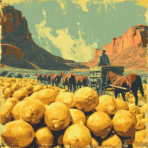 cowboy driving a wagon and horses full of hundreds of lemons, an illustration of a western desert in an abstract style, in the style of minimalist backgrounds, sun-soaked colours, gritty, movie frame --v 6.0