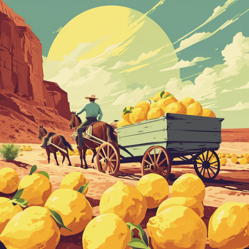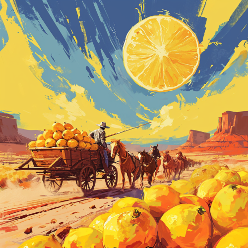 cowboy driving a wagon and horses full of hundreds of lemons, an illustration of a western desert in an abstract style, in the style of minimalist backgrounds, sun-soaked colours, epic landscape --v 6.0