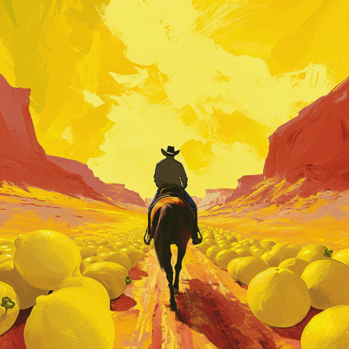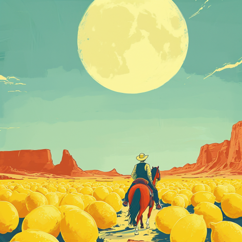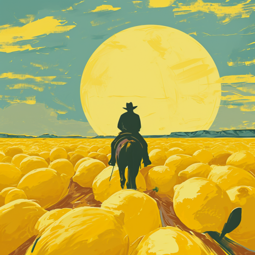 cowboy riding a horse herding a huge heard of lemons that are like cows, an illustration of a western desert in an abstract style, in the style of minimalist backgrounds, sun-soaked colours, epic landscape --v 6.0