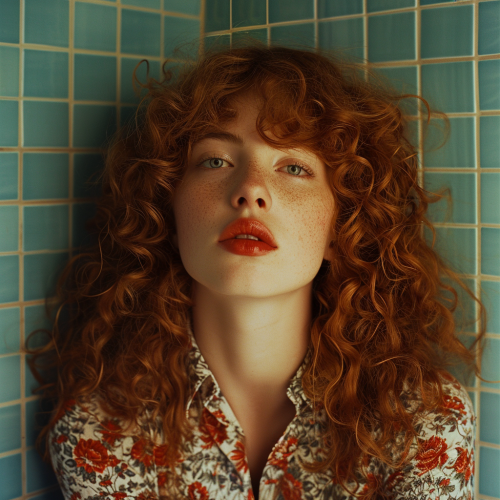 hyperrealistic looks like a real photo portrait of a curly red-head woman indoors against a tiled bathroom wall lookig at caera shot with kodak portra film, style by vogue fashion magazine --v 6.0