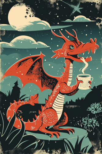 red dragon poster,in the style of celebration of rural life, dark sky-blue and green, the dragon in the poster is holding a coffee cup,vibrant illustrations, suspended/hanging, playful shapes, light red and black, lively illustrations --ar 2:3 --v 6.0
