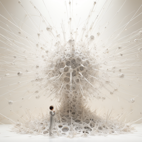 a white background, hanging in empty space, no ground or reference point, pure consciousness of God, represented as an exploding fractal construction hanging in empty galactic space, rays of charged light and events and dreams, genius joyous awakening, each extremity from the source reaches out with a miniature replica of this whole model, white background