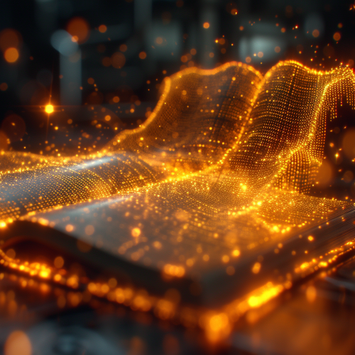 Create an image of a futuristic, note or book. Focus on the yellow color and incorporate elements that reflect a futuristic and sporty aesthetic. wireframe hologram --s 750 --niji 5 --style original