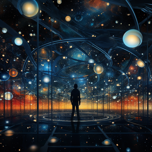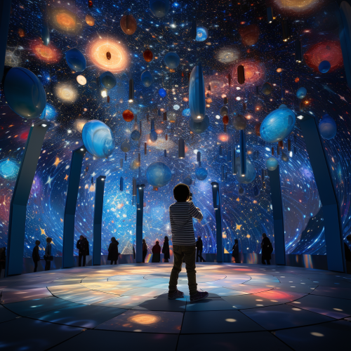 immersive museum, a sky full of stars music inspired, astronomical, blue, colorful, geometric forms, circles, spheres