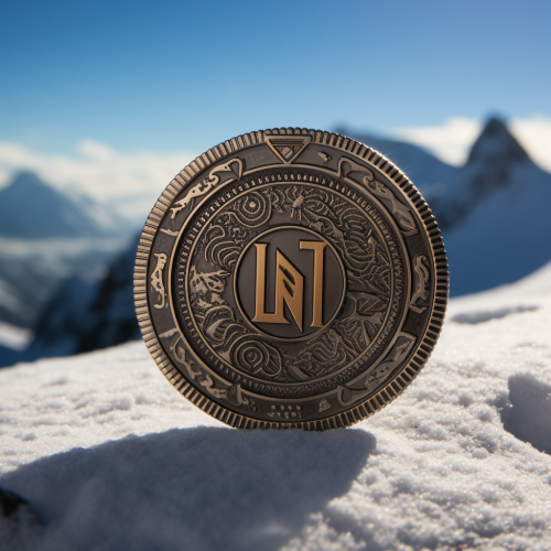 the letters "IZN" on the coin on the snow mountain. simple, cyberpunk --ar 1:1