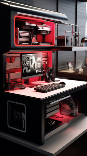 Craft a sleek and modern 3D workstation reflecting the style of a male in his early 20s, a college student; feature your favorite idol photo cards and posters around a PC setup with keyboard and mouse, integrate a broadcasting microphone for versatility; maintain a predominantly black, orderly aesthetic, ensuring high visibility of idol cards and posters; create a cute and youthful 3D representation rather than a realistic photo, --ar 9:16