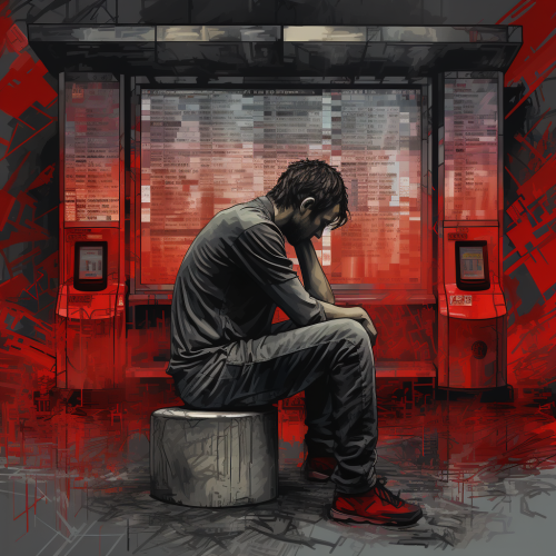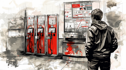blend of a black and white sketch and a realistic colored sketch of a man blended looking at a gas station pump, elated emotional picture that shows the descent of stocks. red stocks declining, vivid, dark --ar 16:9