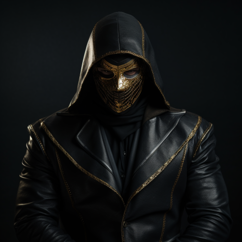 a man weaaring black maske with golden petern lines on it, wearing black long leather coat, realastic 4k, dark background