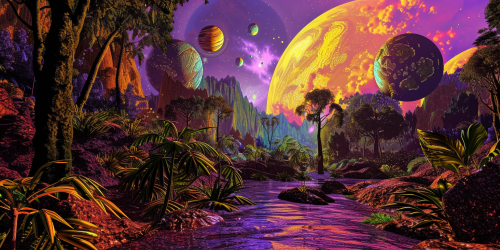 orthographic view of contaminated alien rainforest with orange dusk background. Green bioluminiscent flora with glowing fractal mycelium growing at the jungle trees. Fractal colorful flowers and mushrooms are glowing bright with vivid colors. Spiral ferns are growing in the middle of scene. Colorful giant neon glowing plants in the foreground, by Ivan Trending on High detail --v 6.0 --ar 2:1