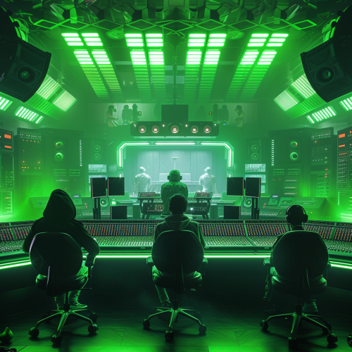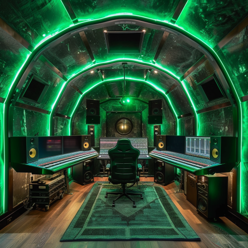 large recording studio designed by aliens, martians are sitting in chairs at the mixing board, neon green lights --v 6.0