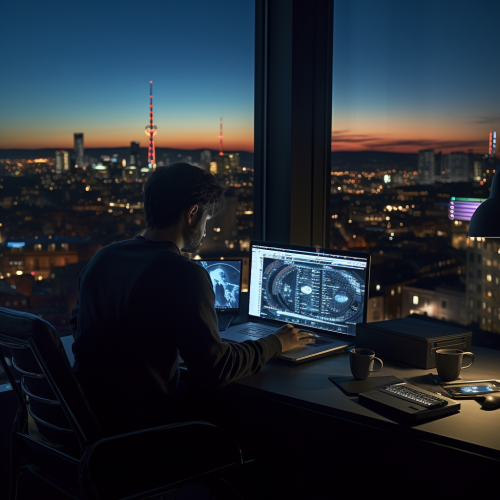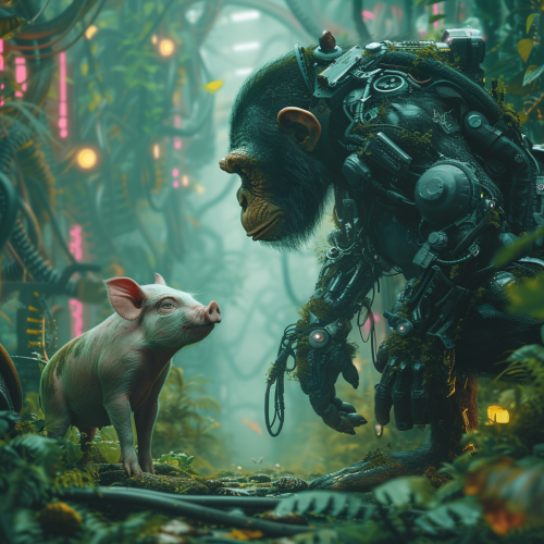 Create a captivating digital artwork featuring an anthropomorphic ape navigating a dense forest of information alongside a truffle pig. Capture the essence of discovery, exploration, and symbiotic partnership amidst the digital foliage of data. --s 250 --v 6.0