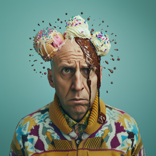 The portrait of a bald man in an ugly jacquard sweater on a garish plain background with slightly melting scoops of ice cream accompanied by whipped cream and chocolate pouring down his sad face placed dirty on his head, realistic photo in pop colors--s 750 --v 6.0 --s 50