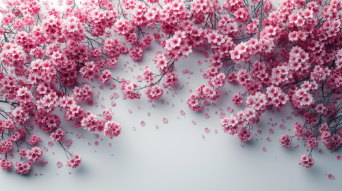 Create a stylish graphic design with a white base. At the top of the image, depict cherry blossom branches blooming in an arch shape. The background should predominantly be white --ar 16:9 --stylize 750 --v 6.0