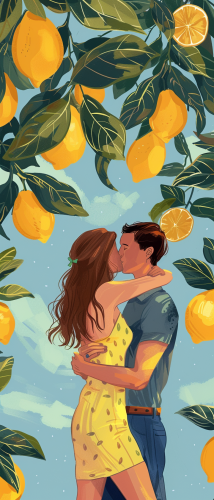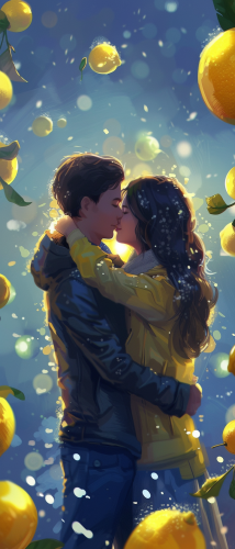 couple hugging, surrounded by lemons, blue gradient background --v 6.0 --ar 3:7