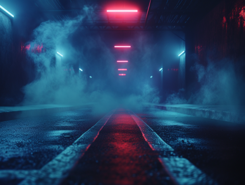 Dark street, asphalt abstract dark blue background, empty open dark scene neon light, spotlights The concrete floor and studio room with faint smoke float up the interior texture for display products, Bright color, ultra realistic --ar 4:3 --stylize 250 --v 6.0