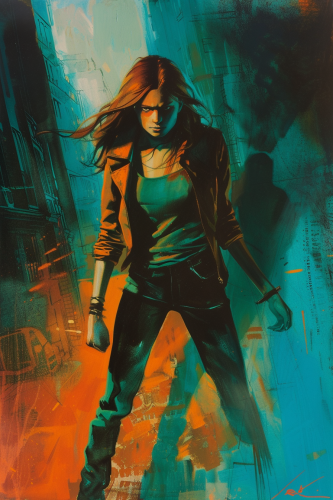 Bill sienkiewicz Drew struzan art style, 2000's graffic novel cover art,a female anti-hero vigilante, teenagers, uses colors orange and teal, perspective shot, cyberpunk vibe, superhero, shadow figures, caucasian girl --ar 2:3 --v 6.0