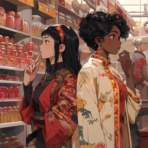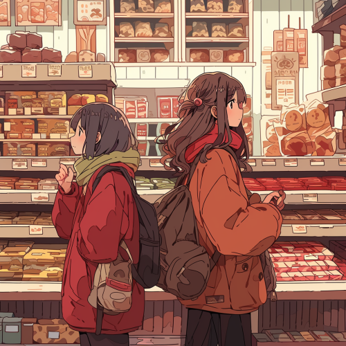couple of girls in a run down convinenant store with their faces looking away stealing chocoloate bars, one is brown skin and the other is chinese, high detail, high quality, complex design, --niji 5