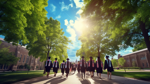 A class of 10 graduate students walking together on a university campus, trees, summer landscape, and beautiful sky, crystal clear image, complementary vivid colors, ultra high resolution, magical touches --ar 16:9