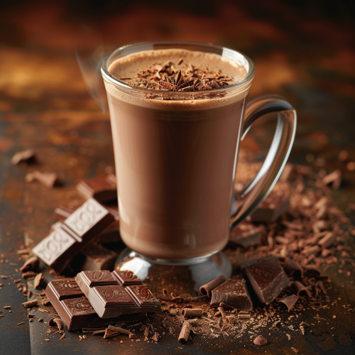 Commerical photography, a glass of hot chocolate, surrounded by chocolate, low angle --v 6.0 --style raw --s 250
