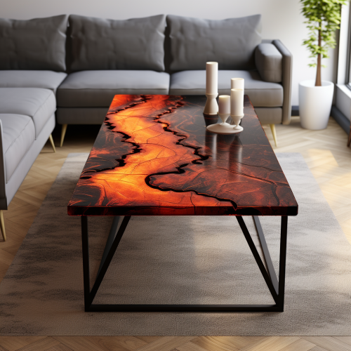 rectangular 3D lava flow center table, make feet of table like overflowing lava, detailed , high quality, background in a living room --ar 1:1
