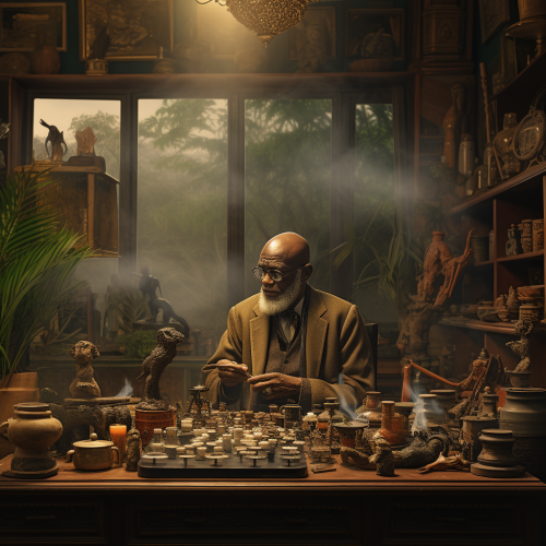 Sigmund Freud smoking a pipe in a room with a window raining outside, wooden desk and several African statues in a 19th century aesthetics room.