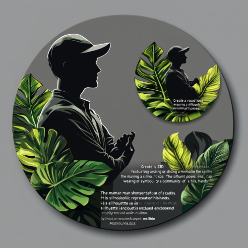 "Create a 3D round logo featuring a minimalist silhouette of the same man in different elegant poses, wearing a shirt and a cap. The man should be holding or cradling a symbolic representation of a community in his hands. His silhouette is enclosed within a circular frame, surrounded by vibrant, realistic plant elements that extend beyond the circle: a Monstera Albo variegated leaf (green with bright white variegation), a Philodendron Dragon variegated leaf (deep green with vivid yellow variegation), and a bold Dark Anthurium leaf (Ace of Spades-shaped, nearly black with dark green hues). The design should emphasize the round shape of the logo, maintaining an organic, modern, and balanced feel. No text, clean and sophisticated." --s 250