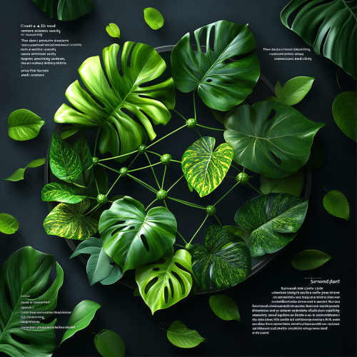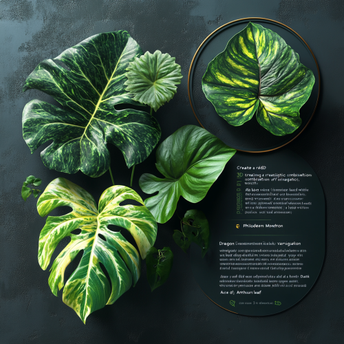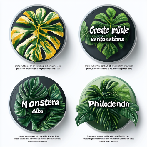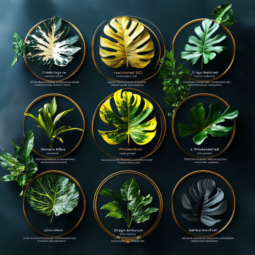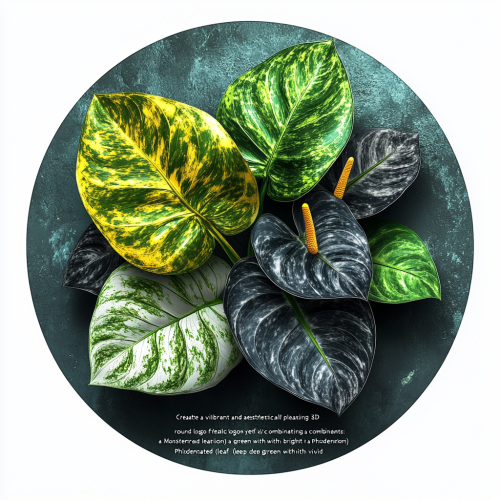 "Create multiple variations of a vibrant and colorful 3D round logo featuring a combination of realistic plant elements: a Monstera Albo variegated leaf (green with bright white variegation), a Philodendron Dragon variegated leaf (deep green with vivid yellow variegation), and a bold Dark Anthurium leaf (Ace of Spades-shaped, nearly black with dark green hues). In each variation, change the positioning of the leaves, placing them under, in the middle, above, and around the circular frame. Leave clear space for potential text or other elements below, in the middle, above, and around the logo. Ensure the design remains colorful, organic, and balanced, with no text. Provide these as transparent PNG images." --s 250