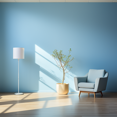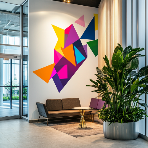 Create a high-resolution image of a bright, modern office with a textured wall. A white adhesive vinyl film with vibrant geometric digital prints is applied to the wall. The area where the film is applied appears smoother than the rest of the wall, but with a subtle texture, showing the film’s ability to adhere to and conform to a rough surface. In front of the wall, place a sleek, modern two-seater waiting sofa, and next to it, add a large monstera plant in a minimalist planter. The scene should emphasize the decorative function of the printed film, the comfortable and professional atmosphere, and the film's durability on a slightly textured surface.