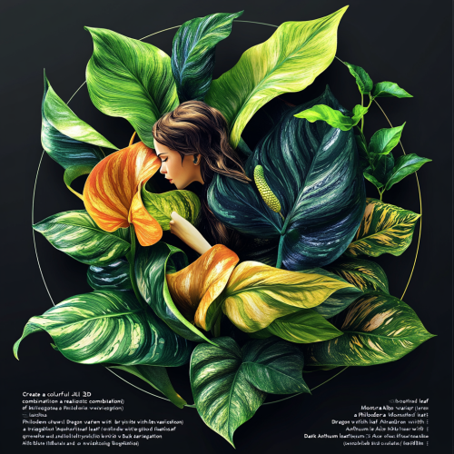 "Create a refined 3D logo featuring a realistic combination of a Monstera Albo variegated leaf (green with bright white variegation), a Philodendron Dragon variegated leaf (deep green with vivid yellow variegation), and a bold Dark Anthurium leaf (Ace of Spades-shaped, nearly black with dark green hues). The figure should be a faceless guy with natural skin tones, subtle and sophisticated clothing, in different elegant poses--such as standing, gently holding the plants, or cradling the circular frame. The face should not be shown, keeping the focus on the plants and pose. Avoid any cartoonish elements, ensuring the design appeals to a 25-45 age audience. No text, and provide the logo as a transparent PNG image." --s 250