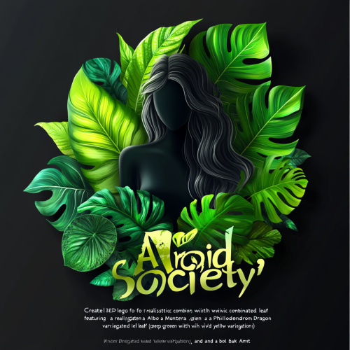 "Create a colorful 3D logo for 'Aroid Society' featuring a realistic combination of a Monstera Albo variegated leaf (green with bright white variegation), a Philodendron Dragon variegated leaf (deep green with vivid yellow variegation), and a bold Dark Anthurium leaf (Ace of Spades-shaped, nearly black with dark green hues). The woman’s silhouette should be in the center, elegant and minimalist, gently holding the circular frame from which the plants extend. Each plant should have distinctive and vibrant variegation, making the design colorful yet balanced. Ensure the woman’s silhouette remains consistent, with slight changes to leaf variegation and position for visual variety. Provide the logo as a transparent PNG image." --s 250