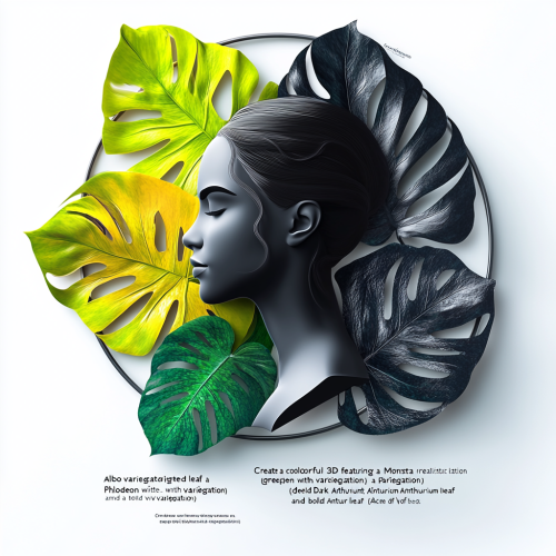 "Create a colorful 3D logo featuring a realistic combination of a Monstera Albo variegated leaf (green with bright white variegation), a Philodendron Dragon variegated leaf (deep green with vivid yellow variegation), and a bold Dark Anthurium leaf (Ace of Spades-shaped, nearly black with dark green hues). The woman’s silhouette should be in the center, minimalist and elegant, gently holding the circular frame from which the plants extend. Each plant should feature distinctive, vibrant variegation, with a more colorful and dynamic palette. No text is included. Provide this as a transparent PNG image." --s 250