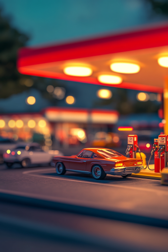The scene takes place at a gas station in the 80s, with highly detailed vintage cars. Use bright, eye-catching colors and detailed images to convey a safe and enjoyable journey. Depth of field, Tilt-shift blur, Shutter speed 1/1000, F/22, White balance, 32k, Super resolution, Pro Photo RGB, Backlight, Backlight, Happy lighting, Incandescent, Soft lighting, Surround, Conte jour, Global illumination, Screen-space global illumination, Scatter, Shadows, Harsh, Flicker, Backlight flare, Screen-space flare, Diffraction estimation, Chromatic aberration, GB bias, Scanlines, Ambient occlusion, A RTX, SSAO, OpenGL shaders, Post-processing, Post-production, Cell shader, Tone mapping, CGI, VFX, SFX, Insanely detailed and complex, Hyper maximalist, Elegant, Dynamic pose, Photography, volumetric, ultra detailed, complex detail, super detailed, ambient --ar 2:3