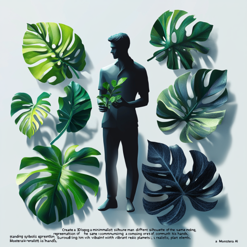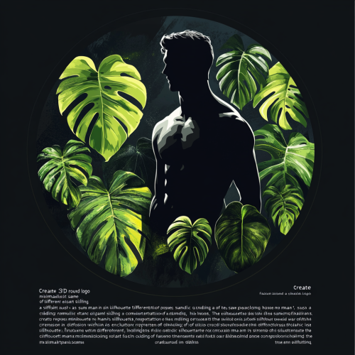 "Create a 3D round logo featuring a minimalist silhouette of the same man in different elegant poses, such as standing, holding, or cradling a symbolic representation of a community in his hands. The man’s silhouette is enclosed within a circular frame, with vibrant, realistic plant elements extending beyond the circle: a Monstera Albo variegated leaf (green with bright white variegation), a Philodendron Dragon variegated leaf (deep green with vivid yellow variegation), and a bold Dark Anthurium leaf (Ace of Spades-shaped, nearly black with dark green hues). The design should emphasize the round shape of the logo, maintaining a balanced, organic feel. No text, modern, elegant, and appealing to a mature audience." --s 250