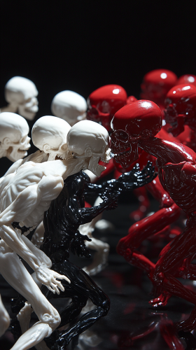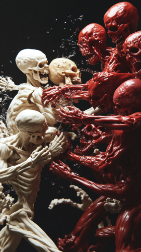 Two groups of heavily muscular figures made from glossy plastic with skulls for heads, engaged in a brutal battle against each other. One group is white, the other is red. The scene is set on a dark background, with the intense confrontation shown slightly from the side and overhead, as if part of a diorama. The battle is fierce, and the shot is taken from a slight distance to capture a larger number of combatants, emphasizing the chaotic, violent clash between the two forces --ar 9:16