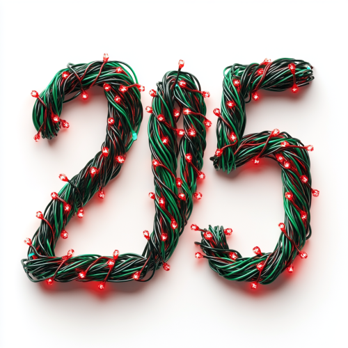 Twisted string of red and green wires forming the number ‘2025’, with small glowing bulbs evenly spaced along the wires, arranged clearly and neatly, isolated on a white background, no shadows –ar 1:1 --s 250 --style raw