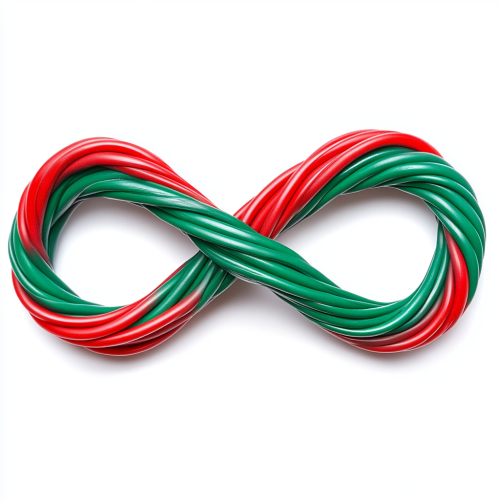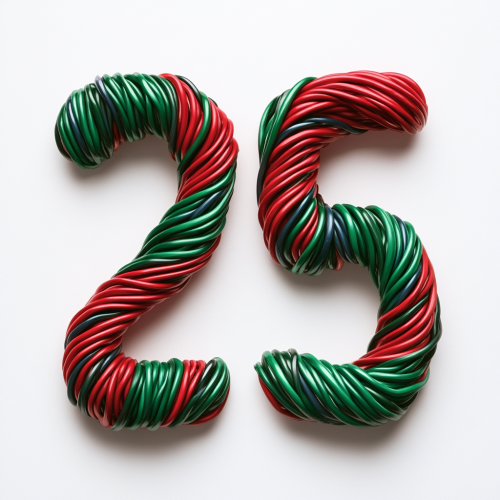 Twisted pair of red and green wires forming the number 2025, arranged clearly and neatly, with realistic texture and details, isolated on a white background, no shadows –ar 1:1 --s 250 --style raw