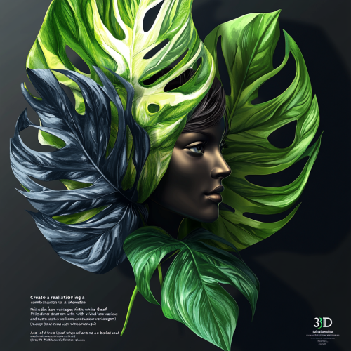 "Create a refined 3D logo featuring a realistic combination of a Monstera Albo variegated leaf (green with bright white variegation), a Philodendron Dragon variegated leaf (deep green with vivid yellow variegation), and a bold Dark Anthurium leaf (Ace of Spades-shaped, nearly black with dark green hues). The figure should be a faceless guy positioned in the center, with natural skin tones and wearing sophisticated, modern clothing. His face should be partially or fully obscured by the plants, ensuring that the focus remains on the vibrant leaves. The guy should be depicted in different elegant poses, such as standing or gently cradling the plants. The design must be mature, organic, and appealing to a 25-45 age audience, with no cartoonish elements. No text is included, and the logo should be provided as a transparent PNG image." --s 250